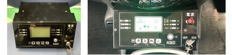 インバーターは車両後部の収納スペースに設置する為に、確認や設定を行うには収納スペースのカバーを開けて行う事になり、実際の運用には不便で支障も有りますが、これらにより運転席でインバータのON/OFFやPV入力、AC出力等の各電圧、電流などが判り色々な設定もここで行え、この操作パネルと表示部だけで電力を出力する為の機能を全て監視・制御できます。
